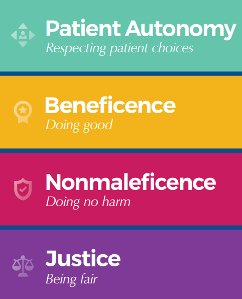 The document outlines the core principles and duties of the profession, organized around four bioethical principles: